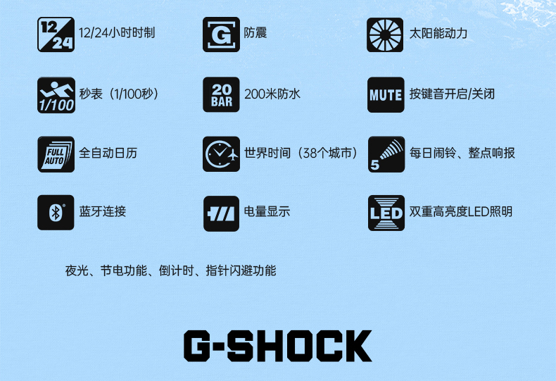 | 人群: | 男士 | 功能关键词: | 蓝牙,秒表,太阳能动力,防水,防震,世界时间,指针 |